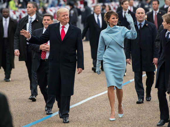 Ralph Lauren Collection designed the knee-length, powder-blue dress Melania wore to Trump’s inauguration in 2017, as well as the coordinating shrug and gloves she wore with the look.
