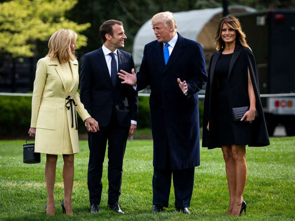 Melania greeted President Macron of France and his wife, Brigitte, in a black minidress and black pumps at the White House.