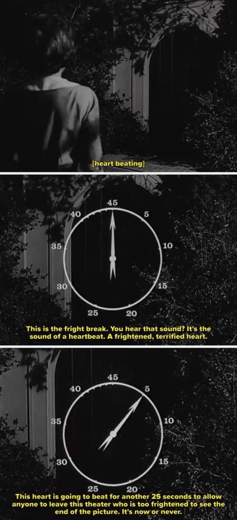 3. Homi­ci­dal (1961) was made towards the end of the Hays Code and sort of pushed the bound­aries of what was allowed. You’ll see why when the big twist in this hor­ror-thriller is revealed, so I won’t spoil any­thing for you now. Just know that this film was deemed so scary that it lit­er­al­ly includ­ed a 45-sec­ond “fright break” that appeared on screen before the cli­max, which told view­ers they could request a full refund from the movie the­ater if they were too scared to fin­ish watch­ing.