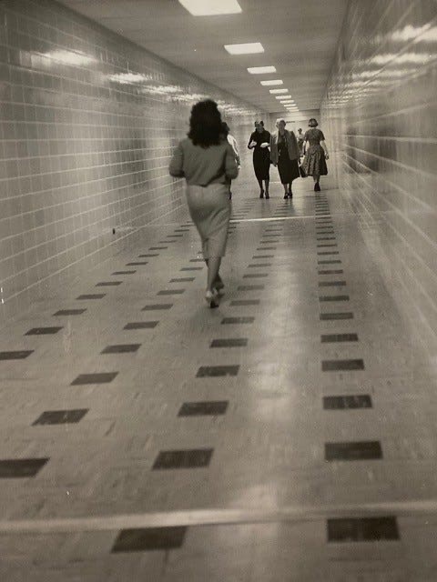 Peo­ple walk through the sub­way between the north and south wings of the Capi­tol in March 1960.