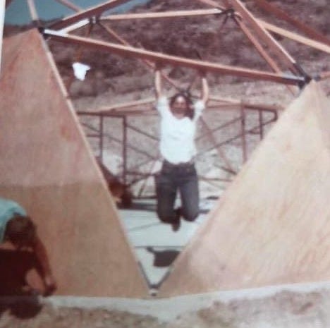 Francine Hard­away hangs out while John Hard­away works on the Sun­nys­lope dome in the late 1960s.