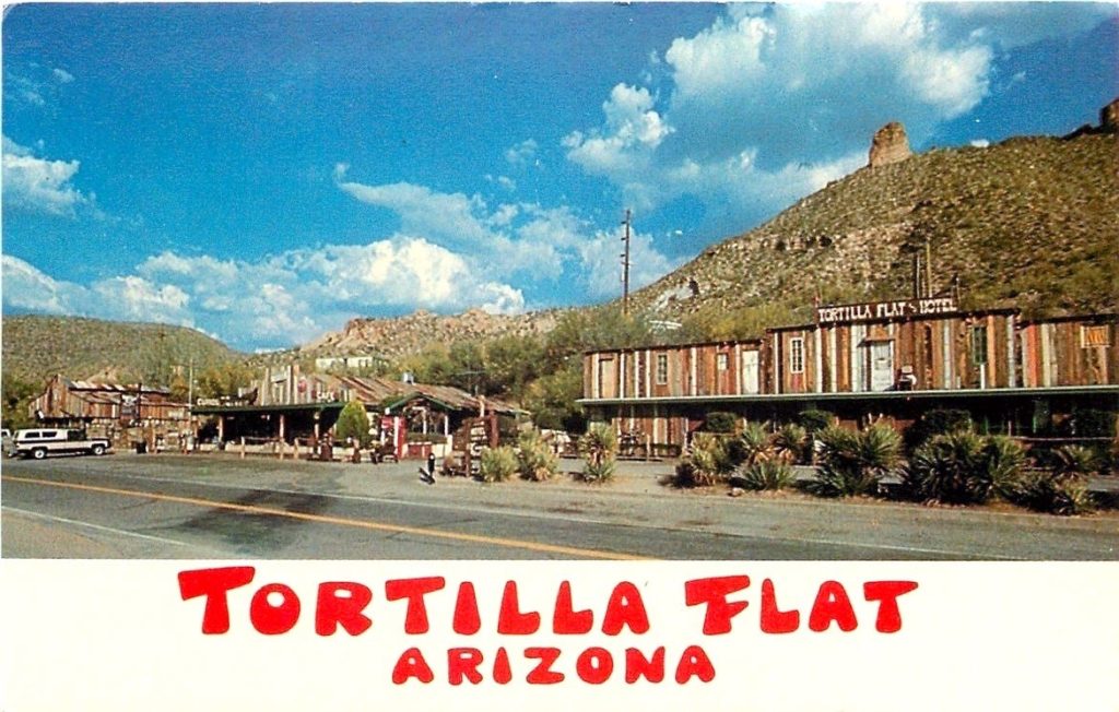 By the ear­ly 1960s when this post­card pho­to was sold, Tor­tilla Flat had grown from a turn-of the-cen­tu­ry stage stop and sup­ply point along the Apache Trail into a pop­u­lar tourist stop offer­ing food, lodg­ing curios and oth­er ser­vices.
