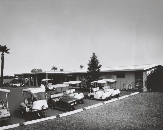 Three-wheeled golf carts were pop­u­lar in Sun City dur­ing the 1960s.