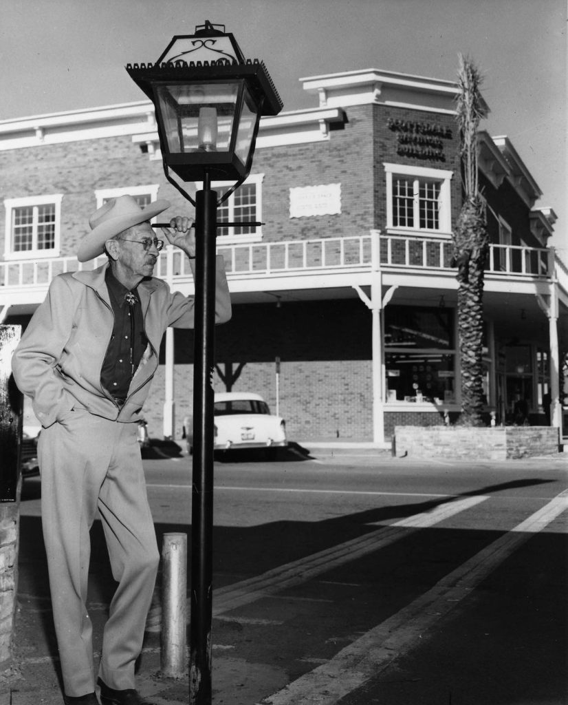 Unknown sub­ject stand­ing on the cor­ner with the Scotts­dale Sav­ings Build­ing in the back­ground. In 1960 it also hous­es the Wig­wam Depart­ment Store.