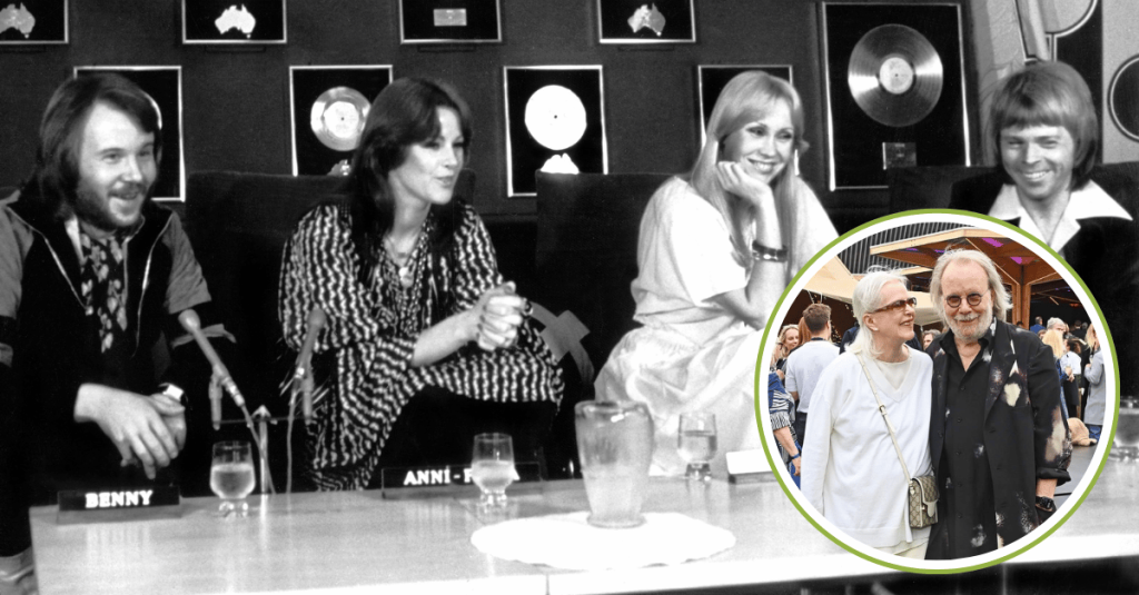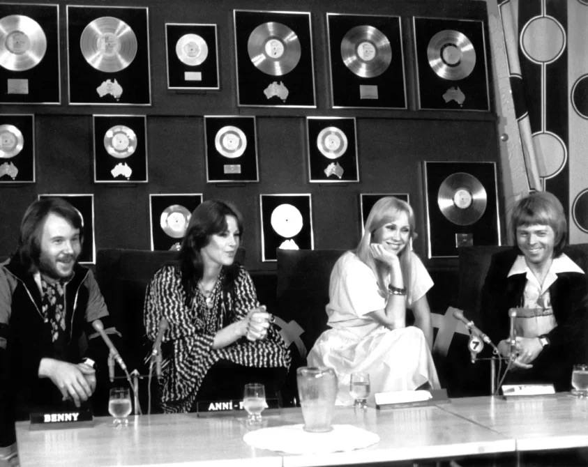 Abba, [Benny Andersson, Anni-Frid Lyngstad (aka Frida), Agnetha Faltskog, Bjorn Ulvaeus], at Australian Press Conference, circa late 1970sThey spoke briefly to the crowd, thanking everyone for their years of support and remembering how long it had been since ABBA first began. Frida also mentioned that she is turning 80 this year, and the audience responded with loud cheers. The other members of ABBA, Agnetha and Björn, did not attend the event.