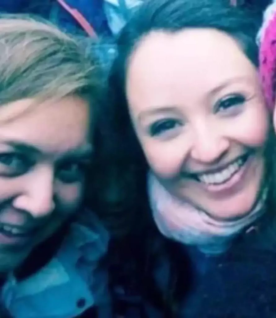 At first glance, the picture appears harmless: six smiling hikers posing together against a lush green backdrop, with other walkers scattered in the distance. But a closer look reveals something that doesn’t quite belong. Between two women on the left side of the frame, a pale face seems to peek through the gap — as if photobombing from another world.