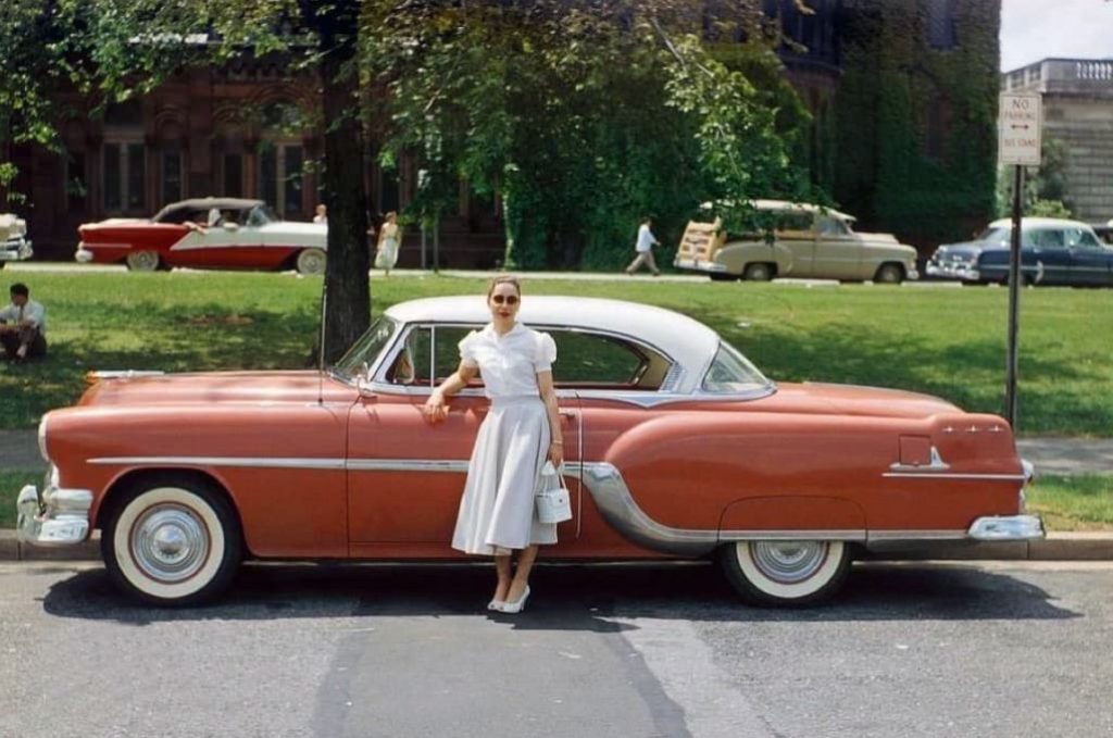 A stylish lady was posing with a sharp 1954 Pontiac Star Chief Custom Catalina on a warm sunny day. This was the first year for the Star Chief line and the last year for the flathead straight eight engine that went back to 1933. Other two tones in the background were from the left a red and white 1954 Oldsmobile Starfire Ninety-Eight with a 1953 Ford nosing in behind it, and a white over blue 1954 Plymouth Savoy 4 door sedan followed by a tan 1951 Chevrolet De Luxe Station Wagon.