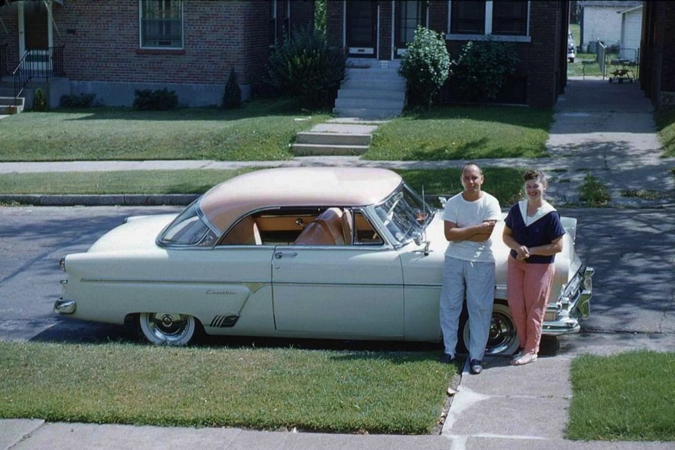 Warm days are a good time for a cruise, and it looked like that was what this couple and a 1954 Ford Crestline Victoria were up to. The windows were down and the driver had a seat pad for extra support. The big news for Ford this year were the choice of two overhead valve engines, the all-new 239 cubic inch Y‑block V8, and the 223 cubic inch I‑block Six cylinder, an enlarged displacement version of the previous 215 cubic inch six that first arrived in 1952. Both were available in all body styles.
