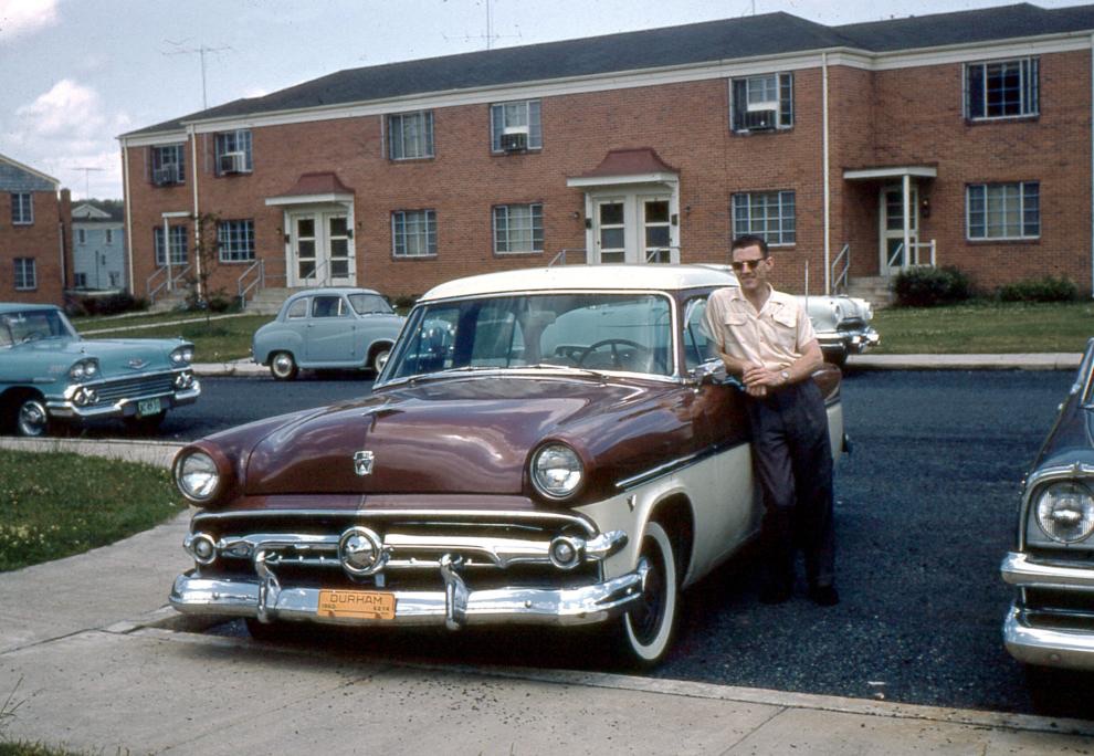 The photo notes on this one report the location was Durham, North Carolina, and the year 1960. North Carolina did not require front license plates, but the City of Durham was kind enough to provide one. This Ford Customline Fordor sedan was also a 1954 model, and did have the new Y‑block V8 along with a custom two tone treatment with the white lower body. To the right was a 1957 Dodge, and to the left a V8 powered 1958 Chevrolet Bel Air Impala convertible with what appears to be a Maryland license plate. Across the street on the left an Austin A35 2 door saloon, with a white over blue 1956 Pontiac 870 or 860 4 door station wagon in front of it.