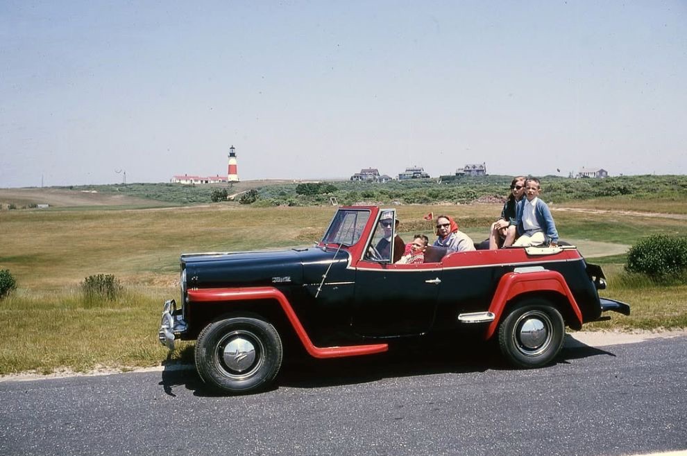 The whole gang was out for a ride in a Willys-Overland Jeepster on a not so warm day. These were built from 1948 through 1950, and the first two years were the same while the 1950 model received a ‘V’ shaped grille and new front fenders. So this one was a 1948 or 1949 model and had a mild custom paint job as the fenders were the same color as the main body from the factory. Search results indicate the lighthouse in the background was the Sankaty Head Light on Nantucket Island, Massachusetts