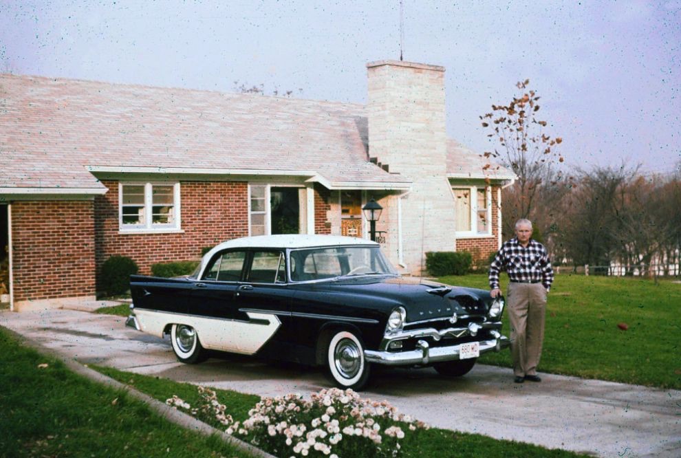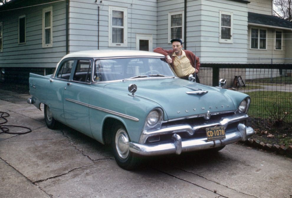 This looks like a hard working man who may have washed his 1956 Plymouth Savoy 4 door sedan recently since the hose was still out. It had the 277 cubic inch Hy-Fire V8, three outside mirrors, and a 1959 Michigan license plate issued in Wayne County, the home of Detroit. The Savoy was the mid range trim line of three and this sedan was actually the best seller for the year