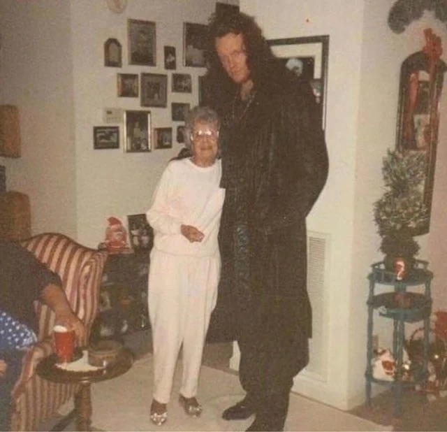 The Under­tak­er pos­es with an old­er woman, c. 1990s