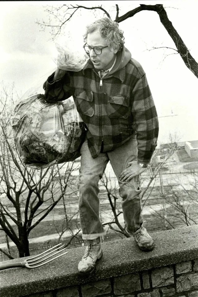 Burling­ton May­or Bernie Sanders picks up trash on his own in a pub­lic park after being elect­ed in 1981.