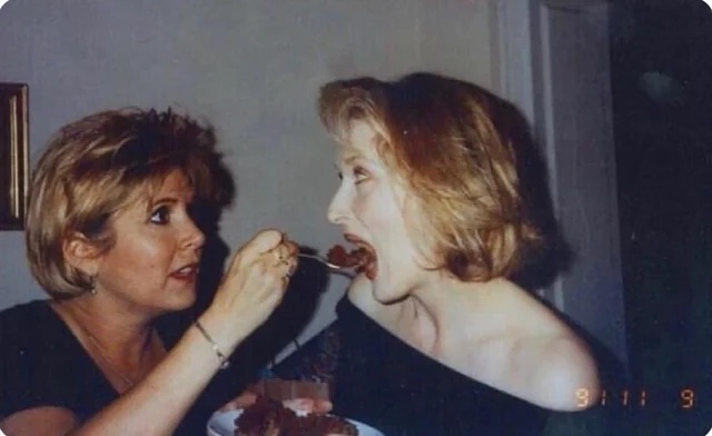 Car­rie Fish­er feeds Meryl Streep choco­late cake, 1991