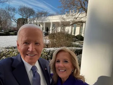 White House Final Pho­to: On their last day at 1600 Penn­syl­va­nia Avenue, Joe and Jill paused for one final self­ie, smil­ing bright­ly in the win­ter sun as they bid farewell to a chap­ter of ser­vice and love