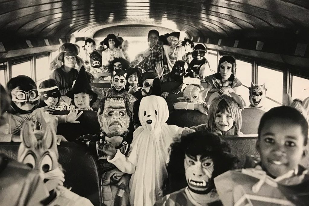 Elementary school students from Austin D. Baltz Elementary School board the school bus in full costume on October 29, 1981