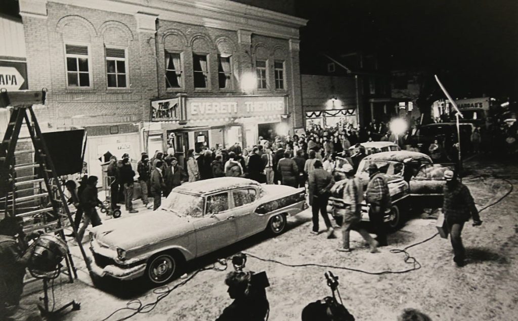 Filming for the movie “Dead Poets Society” outside the old Everett Theatre in Middletown. The Special Effects crew needed to make the location loom like it had snowed so they lined the street with crushed limestone and crushed marble and sprayed the sidewalks and trees with soap. 12/8/88