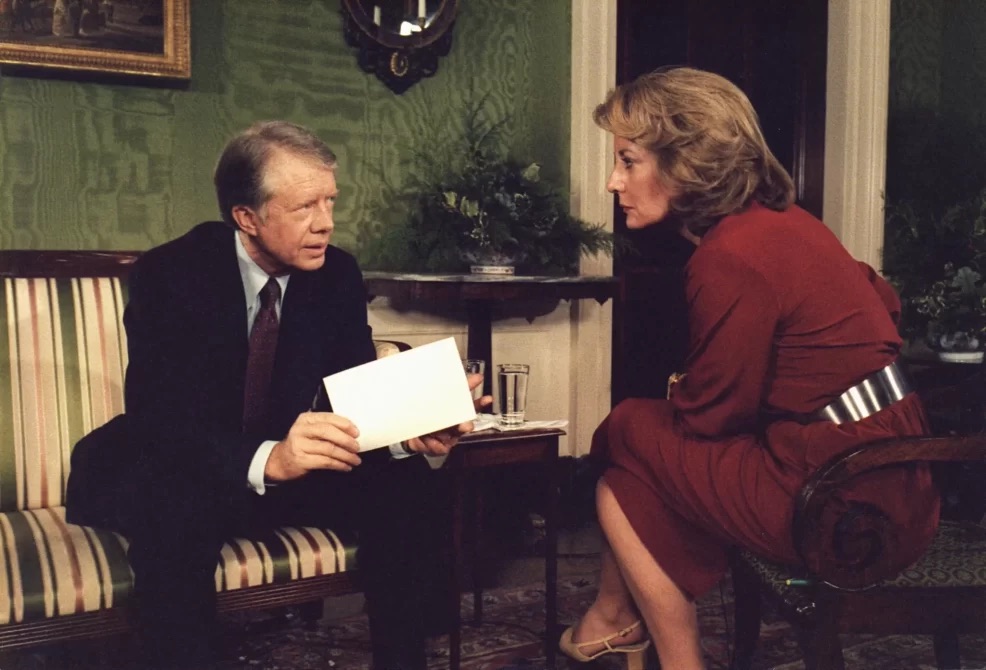 Barbara Walters interviewing President Jimmy Carter in the White House Green Room on Dec. 28 1977.. For Editorial Use Only