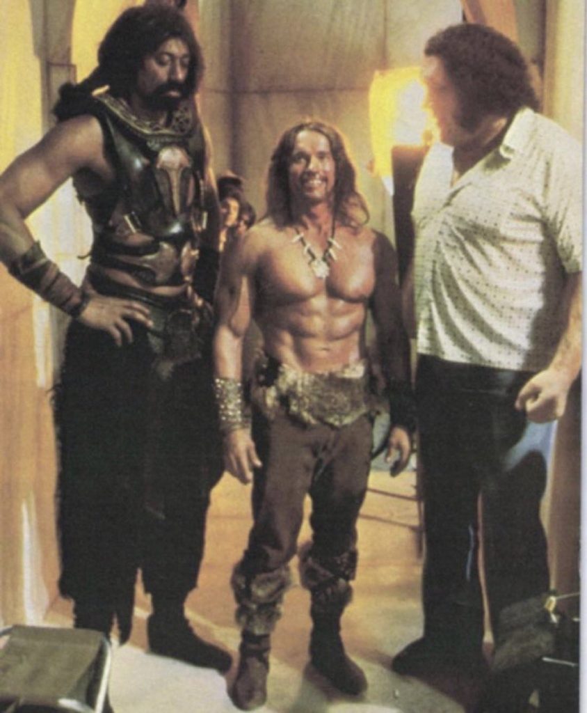 Arnold Schwarzeneg­ger with Wilt Cham­ber­lain and Andre the Giant on the set of Conan the Destroy­er, 1983