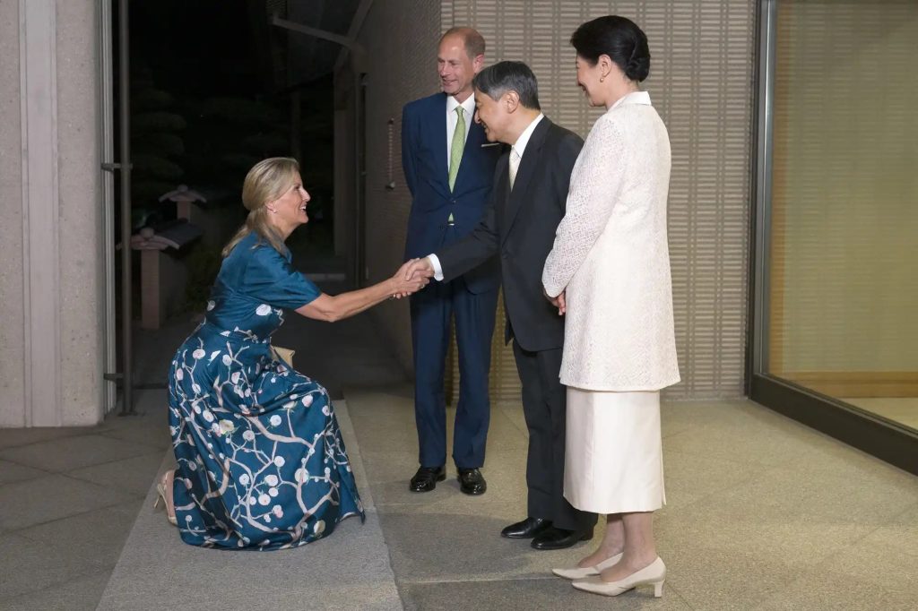 Sophie dropped into a deep curtsy as she and Edward met Emperor Naruhito and his wife, Empress Masako.