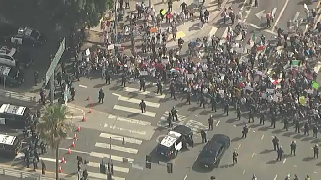 An unlawful assembly was declared in downtown Los Angeles due to demonstrators throwing bottles, rocks and other objects at officers, the Los Angeles Police Department’s Deputy Chief Emada Tingirides said.
