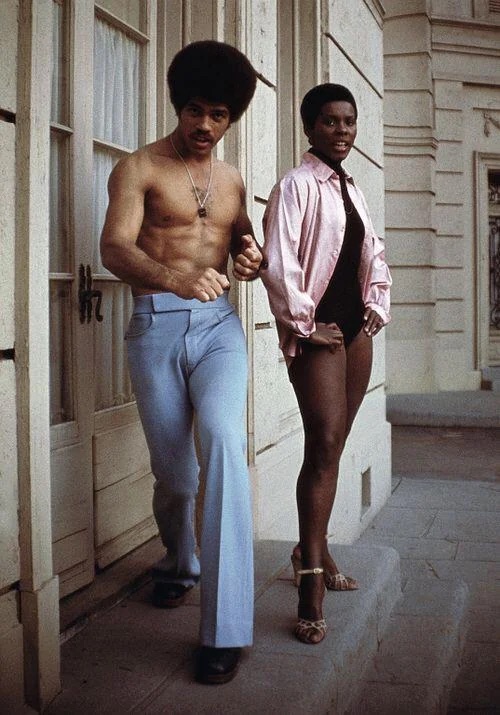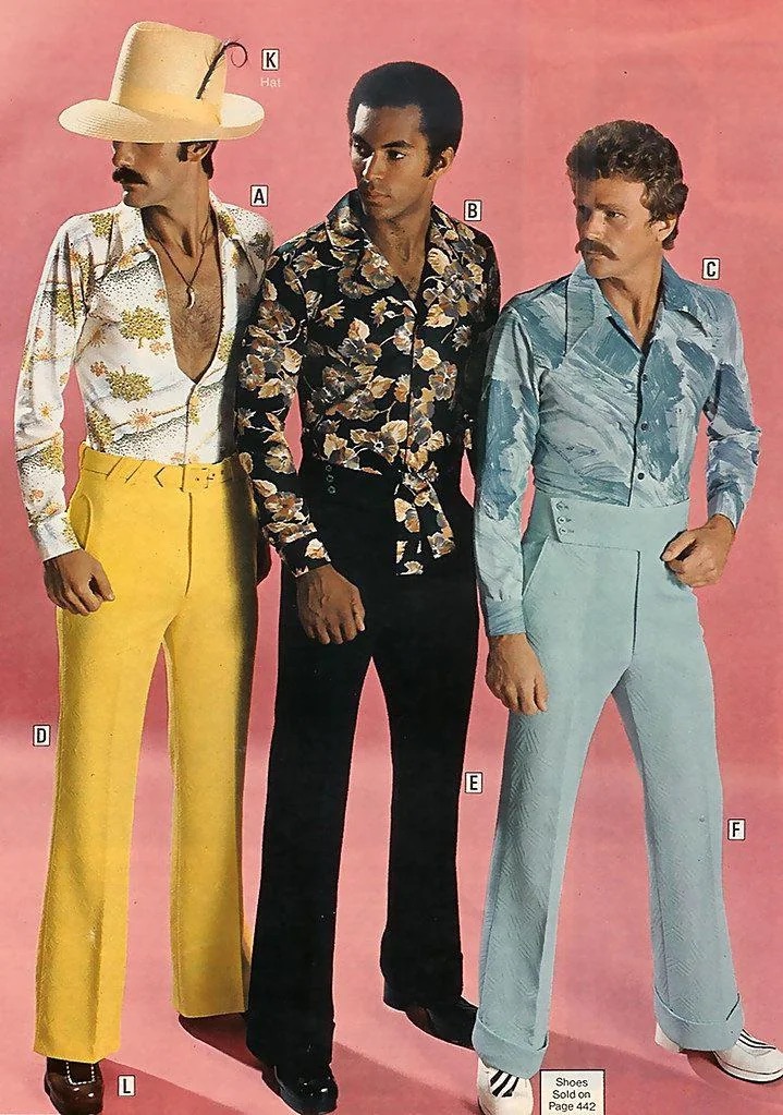 By the mid-to-late ’70s, dis­co cul­ture took cen­ter stage. Night­clubs like Stu­dio 54 became fash­ion run­ways in their own right. Sequined dress­es, metal­lic fab­rics, glit­tery jump­suits, and plat­form shoes defined the look. Men embraced shiny shirts, flared trousers, and bold prints, while women went for slinky sil­hou­ettes that shim­mered under the dance floor lights. The dis­co look was all about being noticed — dra­mat­ic, daz­zling, and full of ener­gy.