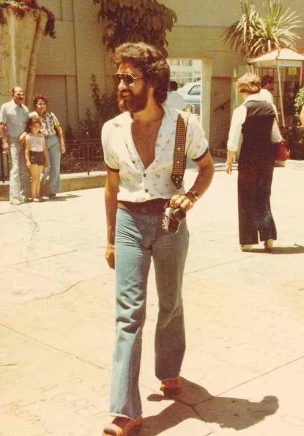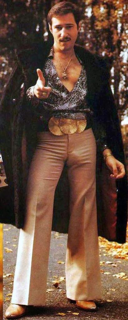 Few trends define the 1970s more than bell-bot­tom jeans. Worn by both men and women, these flared pants became a wardrobe essen­tial. Den­im explod­ed in pop­u­lar­i­ty, with jeans being paired with every­thing from turtle­necks and peas­ant blous­es to leather jack­ets. High-waist­ed cuts and wide col­lars gave out­fits a dis­tinc­tive look, while patch­work and embell­ish­ments allowed for per­son­al cre­ativ­i­ty.