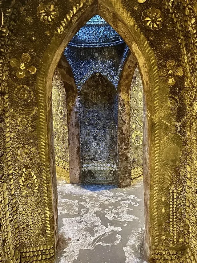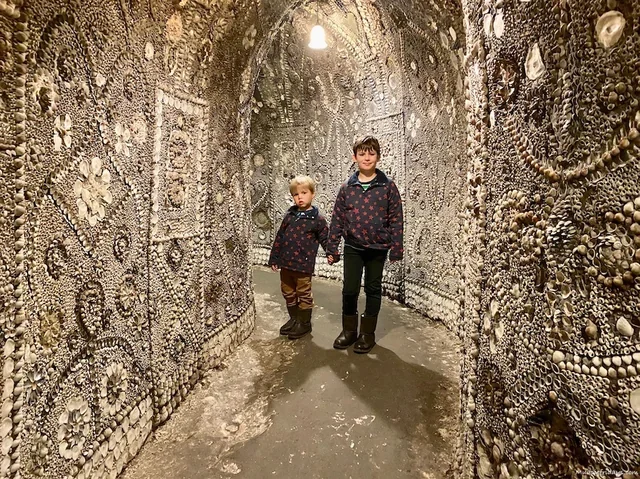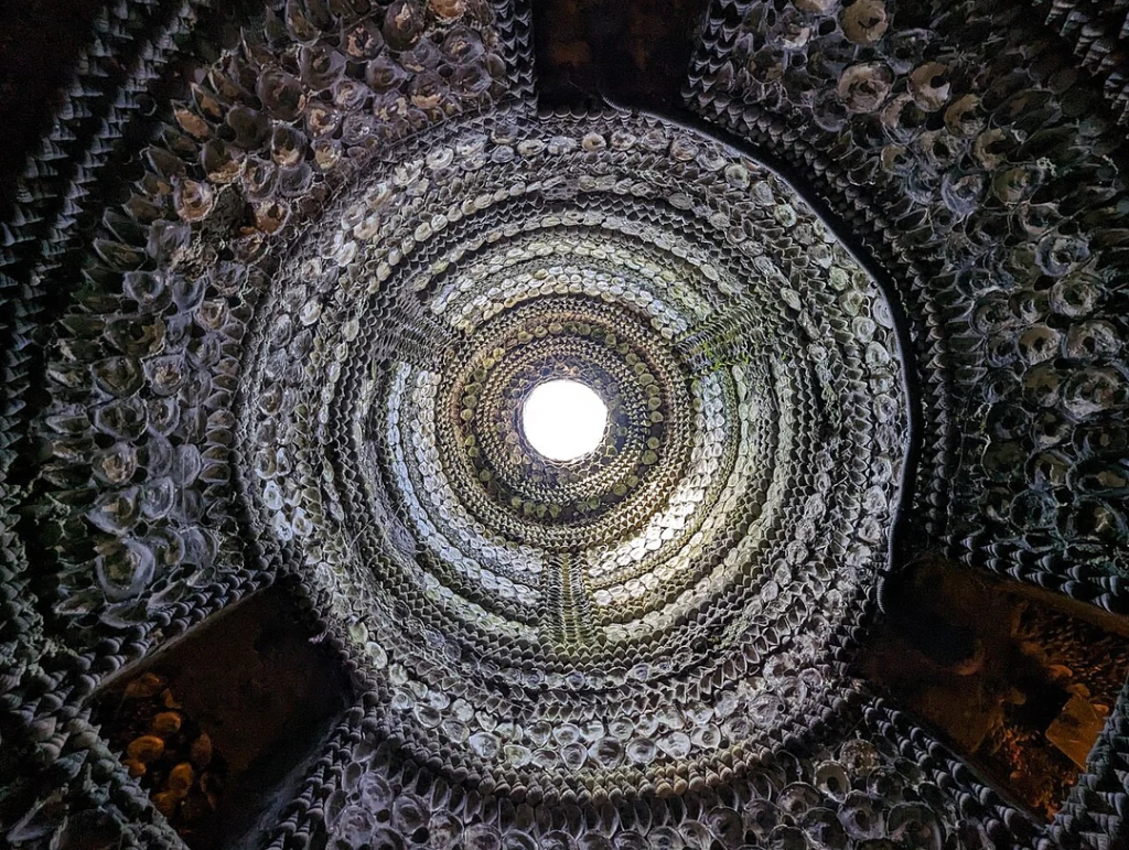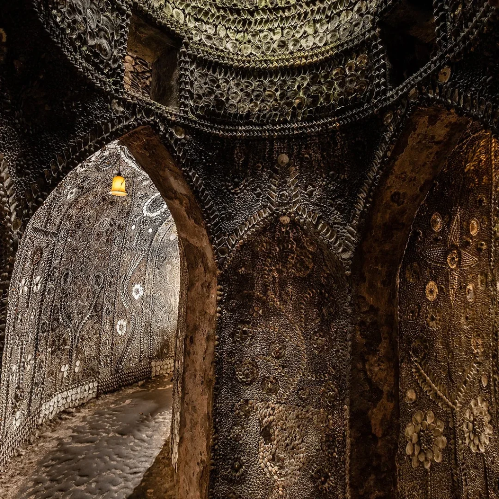 Today, you can still descend the nar­row steps, trace your hand along its glis­ten­ing walls, and stand beneath the domed “altar room” where light from above spills like a divine spot­light onto the shell mosaics below.