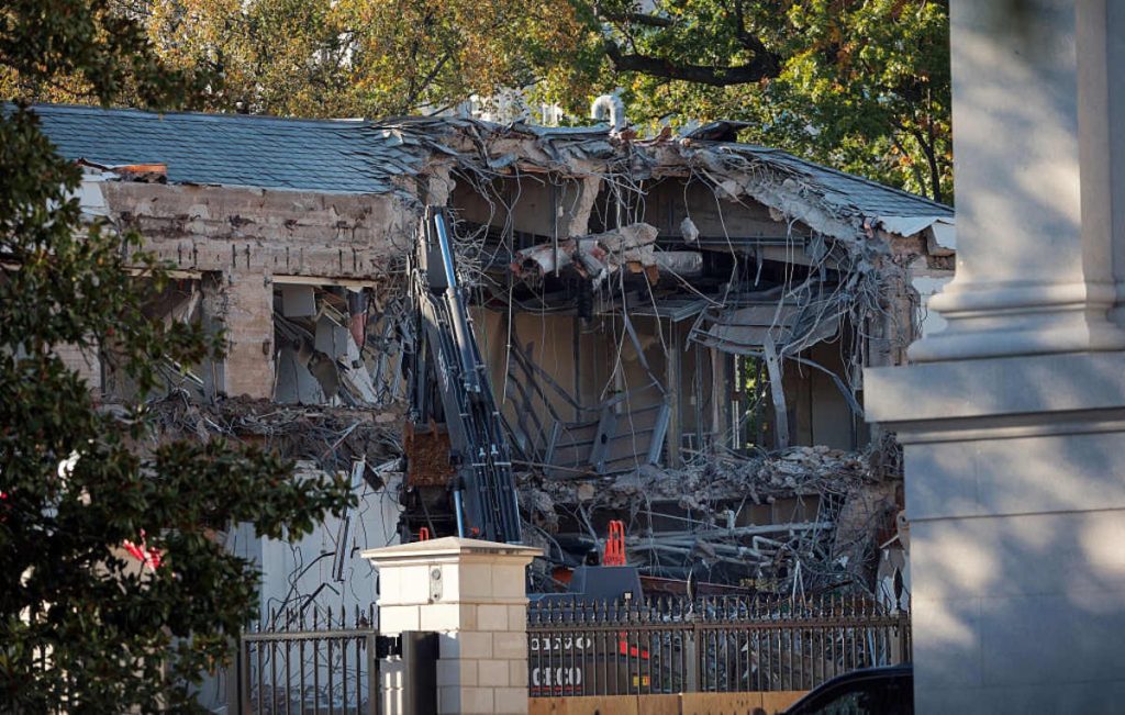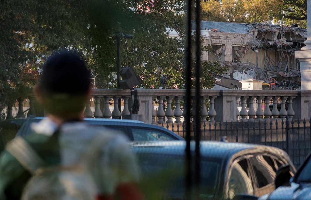 Pho­tos showed heavy con­struc­tion equip­ment tear­ing into the cen­tu­ry-old East Wing, send­ing crash­ing sounds echo­ing through the White House grounds as staff and reporters looked on.