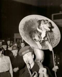 French soldiers passing by a dog wearing googles and smoking a pipe, 1915