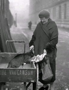 A lady feeding a homeless cat during World War II, Paris. 1939–1945.