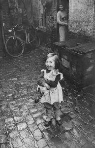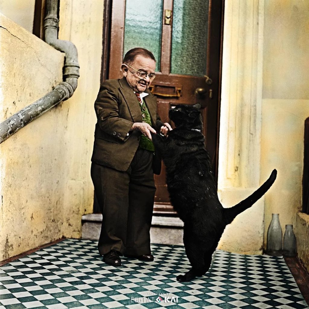 Dwarf Henry Behrens dances with his pet cat in the doorway of his Worthing home, 1956