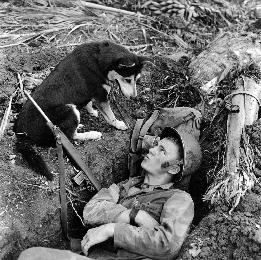 A scouting dog and a US Marine who is comfortably occupying a foxhole in Guam, during World War II, 1944