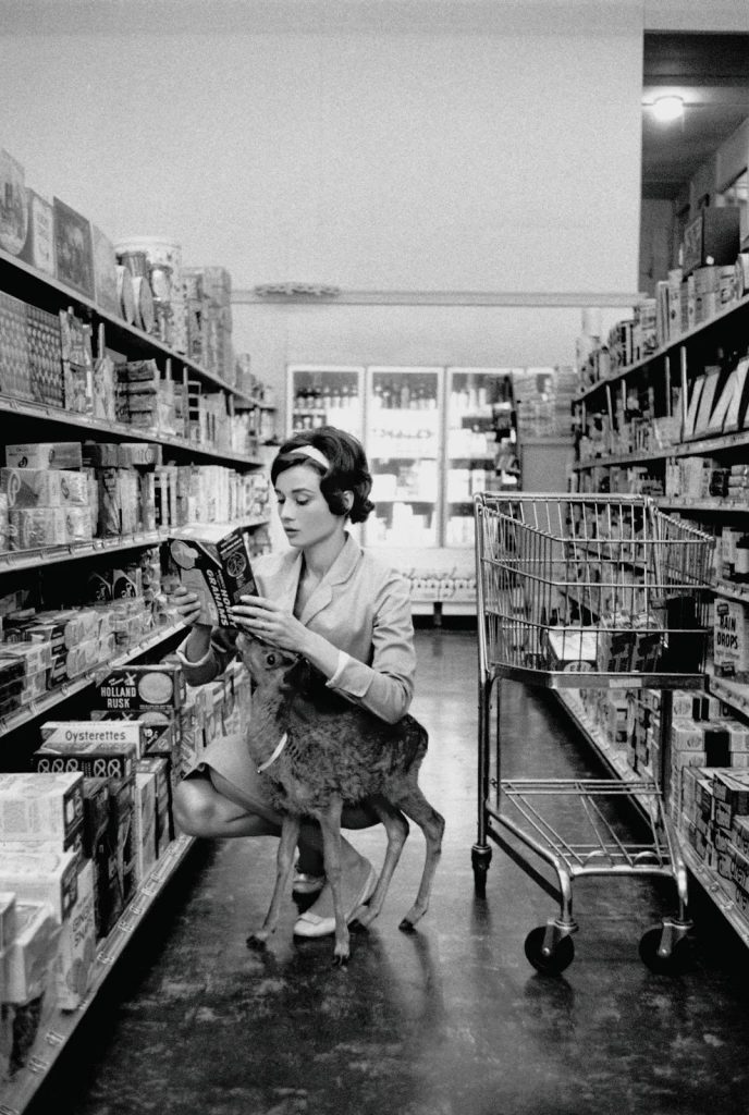 Audrey Hepburn shopping with her pet deer “Ip” in Beverly Hills, CA, 1958