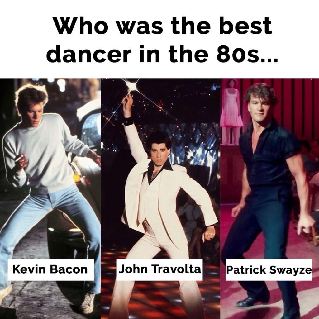 This image asks a fun nos­tal­gic ques­tion: “Who was the best dancer in the 80s?” and shows: