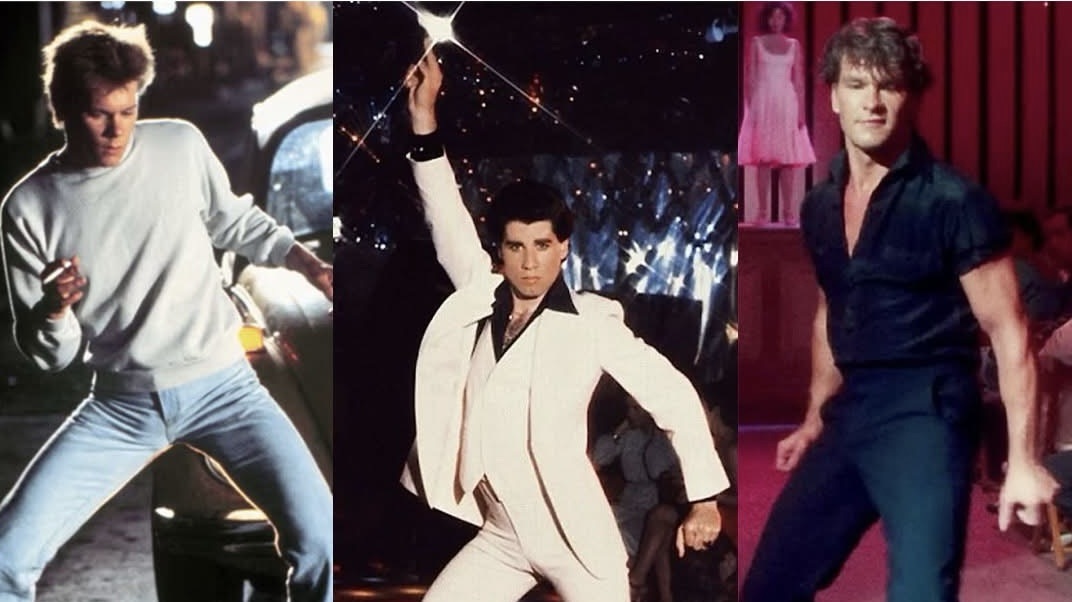 Kevin Bacon (from Foot­loose, 1984) John Tra­vol­ta (known for Sat­ur­day Night Fever, 1977 — icon­ic, though it’s a late 70s film) Patrick Swayze (from Dirty Danc­ing, 1987)