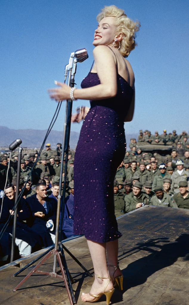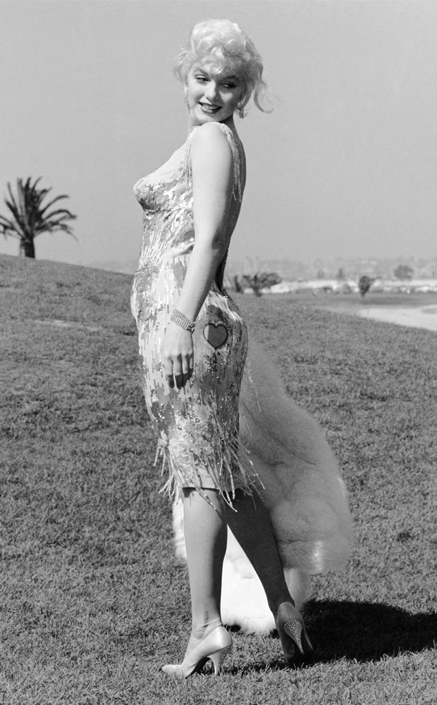 • The skin-tight, rhine­stone-embroi­dered “naked” dress she wore to sing “Hap­py Birth­day, Mr. Pres­i­dent” to JFK at Madi­son Square Gar­den in 1962.