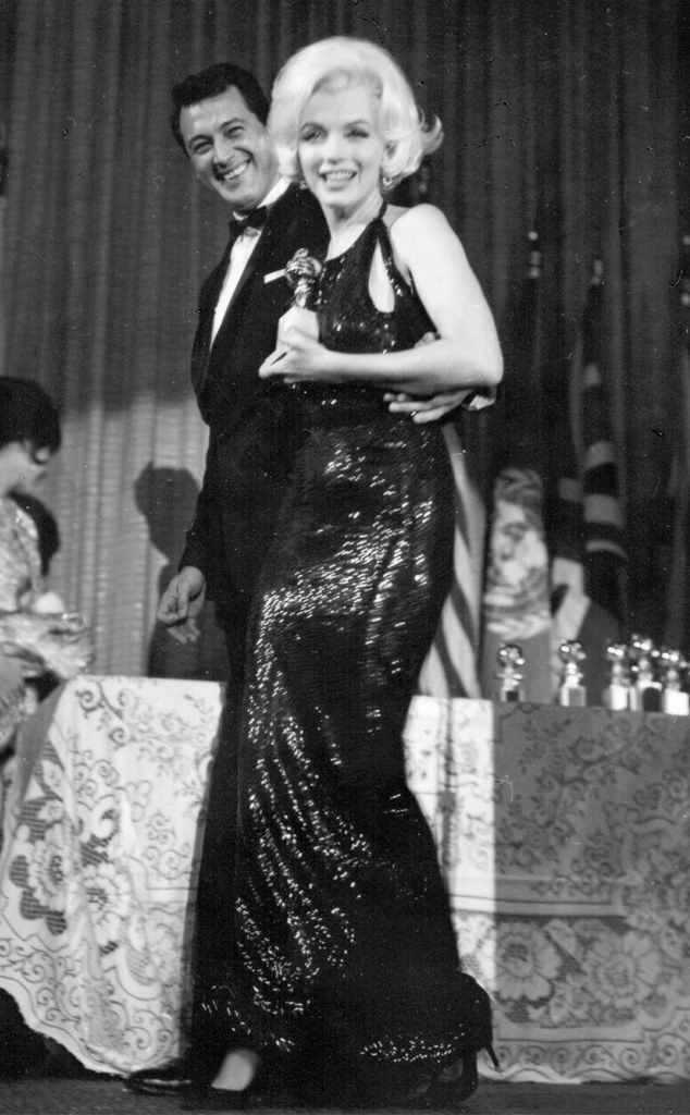 • The shim­mer­ing gold lamé pleat­ed gown that cap­tured her allure in por­traits, and the emer­ald sequined dress she wore to the 1962 Gold­en Globes.